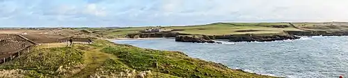 Barclodiad y Gawres (Welsh for "The Giantess's Apronful") is a Neolithic burial chamber between Rhosneigr and Aberffraw on the south-western coast of the island of Anglesey in North Wales. It is an example of a cruciform passage grave, a notable feature being its decorated stones. Similar graves and marks exist across the Irish Sea in the Boyne Valley.[1]