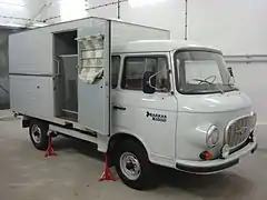 Comparisons with the Volkswagen van of the early 1960s were inevitable. Its front-mounted engine made the Barkas easier to load and more variable in its configuration, with space for up to eight passenger seats.[1] The vehicles were mostly produced for public service applications, with private customer delivery times in the 1960s stretching to heroic levels commonly associated with Trabants, of between ten and fourteen years.[1]