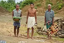 Hojai, the Dimasa Priest (in the middle) with Baruwa (helper) and Dangjuruya (extra helper).