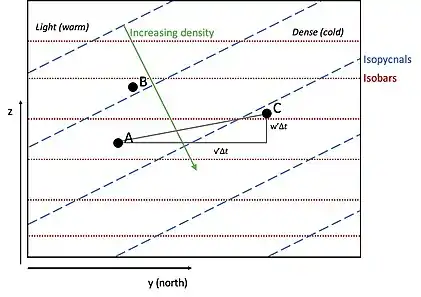 These baroclinic instabilities may be initiated by the process of 'sloping convection' or 'slanted thermal convection'. To understand this, consider a fluid in steady state and under the thermal-wind balance. Initially, a fluid parcel is at location A. The fluid parcel is slightly perturbed to location B, while still retaining its original density. Therefore, the fluid parcel is now in a location with a lower density than itself and the parcel will just sink down to its original position; the fluid parcel is now stable. However, when a parcel displaced to location C, it is surrounded by fluid with a higher density than the parcel itself. Due to its relatively low density with respect to its surroundings, the parcel will float up even further. Now a small perturbation grows into a larger one, which implies a baroclinic instability.