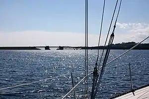 The Barra Strait is over 50 metres (160 ft) deep at its southern entrance between Hectors Point to the west and Derby Point to the east. The strait continues 2.2 km (1.4 mi) to the north-east where it narrows to slightly more than 500 metres (1,600 ft) between Uniacke and Kelly Points. The bottom rises to a maximum depth of 22.8 metres (75 ft) between these points. There is 8 metres (26 ft) draught in the navigation channel through the bridge openings. The tidal stream through the Barra Strait runs the strongest at mid-flood and mid-ebb, and attain a rate of 3 knots. The tidal streams set 010°/190° through the strait, except in the vicinity of the swing bridge span where they are deflected NW and SW by Kelly Point.[6]