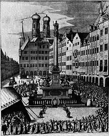 Catholic mass on the Marienplatz in München, around the Pillar of Mary, a symbol of the counter-reformational cult of Mary. In the tent, singers are singing, led by the conductor with a baton.