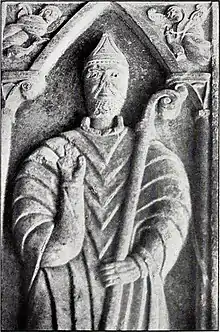 Bartholomew died on 15 December 1184.[8] He was probably buried in Exeter Cathedral.[1] A relief in Exeter has been identified as possibly Bartholomew's effigy for his tomb.[19] A contemporary writer, Gerald of Wales, said that Bartholomew was better educated in Roman law than in canon law.[7] The historian Austin Lane Poole said of him that he "kept out as much as possible out of secular politics, and used [his] learning and practical abilities whole-heartedly for the welfare of the church."[20] During his bishopric, he advanced the career of Baldwin of Forde, as it was Bartholomew who made Baldwin archdeacon.[21] He had two nephews, Jordan and Harold, who were part of his household while he was at Exeter.[1]