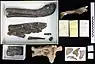 Most of the bones collected were encased in siltstone nodules surrounded by fine sand and silt, with the rest lying in clay. The bones were disarticulated and scattered over a 5-by-2-metre (16.4-by-6.6-foot) area, but most were not far from their natural positions. The position of some bones was disturbed by a bulldozer, and some were broken by mechanical equipment before they were collected.[3][1][6] Preparing the specimen was difficult, due to the hardness of the siltstone matrix and the presence of siderite; acid preparation was attempted, but most of the matrix was removed mechanically. It took six years of almost constant preparation to get all the bones out of the rock, and by the end, dental tools and air mallets had to be used under a microscope. The specimen represents about 65 percent of the skeleton, and consists of partial skull bones, including premaxillae (first bones of the upper jaw); the left maxillae (second bone of the upper jaw); both nasal bones; the left lacrimal; the left prefrontal; the left postorbital; the braincase including the occiput; both dentaries (the front bones of the lower jaw); various bones from the back of the lower jaw; teeth; cervical (neck), dorsal (back), and caudal (tail) vertebrae; ribs; a sternum; both scapulae (shoulder blades); both coracoids; both humeri (upper arm bones); the left radius and ulna (lower arm bones); finger bones and unguals (claw bones); hip bones; the upper end of the left femur (thigh bone) and lower end of the right; right fibula (of the lower leg); and foot bones including an ungual.[3][1][7][2] The original specimen number was BMNH R9951, but it was later re-catalogued as NHMUK VP R9951.[1][8]