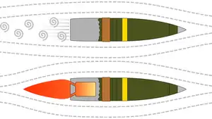 The principles were developed in Sweden in the mid 1960s, by the Försvarets forskningsanstalt (abbreviated FOA), and the Artillery bureau at the Kungliga Materielförvaltningen (later the Försvarets Materielverk (FMV)) while working on a rocket-assisted projectile called "reatil". Their goal was to increase the range of coastal artillery.[1] By 1966, it had been concluded that a small, slow-burning charge at the base of the projectile would alleviate the low pressure behind the shell, hence increasing the range by lessening the difference between the pressure due to aerodynamic drag on the nose of the shell and the low pressure behind the base. The first full-scale tests took place in 1969 with modified 10.5 cm steel shells with excellent results, and the Swedish patent was granted FOA in 1971 although both application and patent were classified. Since the development was done, the patent was transferred to FMV for procurement to the armed forces of Sweden.