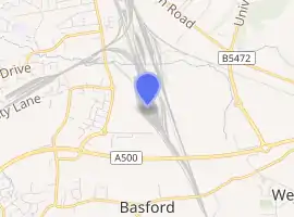 The yard is located some 0.93 miles (1.5 km) south of Crewe railway station[12] and was originally constructed to serve wagonload traffic, which it did until 1972,[6] when all wagonload /Speedlink traffic was concentrated on Warrington Arpley Yard.[3] After Speedlink was closed down, some wagonload traffic continued, and Crewe was used as a marshalling point for terminals in the north west from 1991. A dedicated service ran from Crewe to Dover to connect with the train ferry, and also from Crewe to Mossend Yard. This was the first time that Basford Hall had been used for marshalling since 1972.[13]