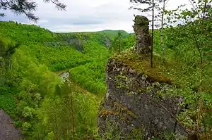 Bashkiriya National Park ( Bashkort:Башҡортостан милли паркы, Russian: Башкирия (национальный парк)), covers a large contiguous forest on the southern end of the Ural Mountains. The park is an important buffer between the industrialized flatlands to the west, and the mountainous and sparsely populated Shulgan-Tash nature reserve and Altyn-Solok ("Golden Bee Tree") entomological reserve to the east and north. Bashkirya National Park lies between the Nugush River (and the popular recreational zone of the Nugush Reservoir), and the southern bend of the Belaya River. The park features deep river valley cuts in a karst topography. It is known for a natural bridge across the river Kuperlya. The park is situated across three districts (Meleuzovsky, Kurgachinsky and Burzyansky) of the Republic of Bashkortostan (also known as "Bashkiriya").[1][2]