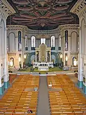 The Basilica was designated a National Historic Site of Canada in 1983, to recognize its architectural uniqueness as one of the earliest North American examples of the Romanesque revival style, and its central role as the spiritual and cultural home of Newfoundland Roman Catholics.[2] The building has also been designated as a Registered Heritage Structure and Provincial Historic Site by the Heritage Foundation of Newfoundland and Labrador. Its builder, Michael Anthony Fleming, was designated a Person of National Historic Significance in 2005. On 1 July 2021, the doors of the building were smeared with red paint, in what appeared to be protest against the Catholic Church’s role in the Canadian Indian residential school system.[3] The same year, it was announced that the Basilica was among properties being assessed for potential sale to compensate men who were sexually abused at the former Mount Cashel Orphanage.[4][5]