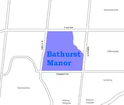 Bathurst Manor is a neighbourhood located in the North York district of Toronto, Ontario, Canada. It sits on a plateau bounded on the north by Finch Avenue West, on the west by Dufferin Street, on the east by the Don River (west branch), and on the south by Sheppard Avenue West. The area is also regarded as part of the Downsview postal area as designated by Canada Post. It is part of the former City of North York, which merged with five other municipalities and a regional government to form the new "City of Toronto" in 1998. It is part of the federal and provincial electoral district York Centre, and Toronto electoral ward 10: York Centre (East). In 2006, it had a population of 14,615.[1]