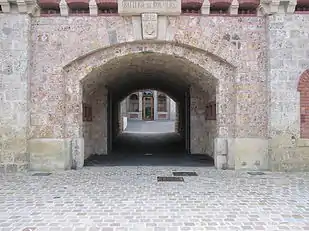 The principal battery, known as the caserne sous le parados (barracks under the entrance) is composed of gun chambers all oriented opening on the northeastern facade, with arched vaults expressed on the main wall as blind arches. Materials include limestone, millstone and brick. Concrete was added after 1879, and was retained in the 2006 renovation. A small bastion protects the entry from direct fire directly opposite the gate.