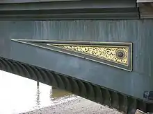 The contract to build the new bridge was awarded to John Mowlem & Co,[11] and in June 1887 the Duke of Clarence laid a ceremonial foundation stone in the southern abutment and construction work began.[16] Bazalgette's design incorporated five arches with cast iron griders, on granite piers which in turn rest on concrete foundations. The roadway itself is 24 feet (7.3 m) wide, and 8-foot (2.4 m) wide footpaths are cantilevered on either side of the bridge,[n 7] giving the bridge a total width of 40 feet (12 m).[11] The balustrade is a distinctive Moorish-style lattice.[37] Construction work was overseen by Bazalgette's son Edward, and cost a total of £143,000 (about £16,090,000 in 2022).[13][17]