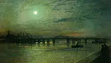 Although the bridge was inconvenient for its users and flimsily constructed, as the last surviving wooden bridge on the Thames in the London area it was considered an important landmark, and many leading artists of the period were attracted to it.[n 6][11] Camille Pissarro, J. M. W. Turner, John Sell Cotman and John Atkinson Grimshaw produced significant paintings of the bridge.[16][23][24] Walter Greaves, whose family owned a boathouse adjacent to the bridge and whose father had been boatman to Turner, painted numerous scenes of the bridge.[25] Local resident and mentor to Greaves James McNeill Whistler created many images of it, including the influential Hokusai-inspired Nocturne: Blue and Gold – Old Battersea Bridge (painted c. 1872–5), in which the dimensions of the bridge are intentionally distorted and Chelsea Old Church and the newly built Albert Bridge are visible through a stylised London fog.[16]