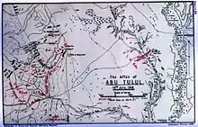 El Mussallabeh had been attacked on 11 April, between the first and second Transjordan raids.[8][9][10] The attack had been launched by a composite force of four Ottoman infantry battalions and several batteries.[11] Subsequently, defensive work was carried out.[12] From early May, when the withdrawal of the forces involved in the second Transjordan attack was complete, the occupation of the Jordan Valley by the Egyptian Expeditionary Force was unchallenged, except for the attacks on 14 July and shelling by long-range Ottoman and German artillery.[13][14]