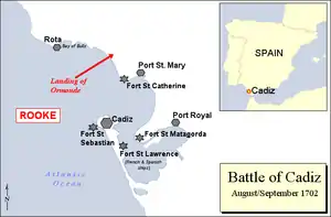 Another option for the Allies was to land the army under the cover of a bombardment by the fleet on the isthmus dividing Cádiz from the mainland; from there, the troops could storm the city. This tactic was Ormonde's preference, but Major-General Sir Charles O’Hara insisted that a landing on the isthmus was inadvisable unless the navy could guarantee the landing of supplies on a daily basis, which, because of the lee shore, they could not.[12] Ormonde's second choice was a blockade, supported by a bombardment of the town; but there was doubt that the ships could anchor close enough for an effective bombardment. In any case, Prince George objected to such a plan for fear of alienating the population.[12] The decision, therefore, was to land the Allied troops between the Bay of Bulls and Fort Saint Catherine. This suited the navy because they could bring their ships near to the shore, and from the beachhead troops could seize the towns of Rota and Port Saint Mary. However, the landing place was a long way from the base of the isthmus on which Cádiz stood.[12] (See map below).