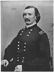 Before Pickett's infantry arrived at Five Forks on March 30, Union cavalry patrols from Brigadier General Thomas Devin's division approached the Confederate line along White Oak Road at Five Forks and skirmished with Fitzhugh Lee's cavalry division.[37][53][59] As they approached Five Forks, a patrol of the 6th United States Cavalry Regiment under Major Robert M. Morris encountered Fitzhugh Lee's troopers and lost 3 officers and 20 men in the encounter.[60] The Confederates also suffered some casualties, including Brigadier General William H. F. Payne who was wounded.[60]