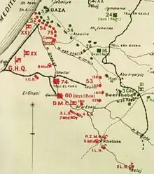 On 24 October the 53rd (Welsh) Division (XX Corps) concentrated between Hisea and Shellal on the Wadi Ghazzeh in the center of the line. The following night the 158th Brigade (53rd Division) crossed the Wadi Ghazzeh, to arrive at El Imara when it extended its right to the Tel el Fara to Beersheba road, covering the railway extension work to Karm.[13]