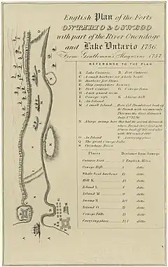Governor Shirley received word in March 1756 that he was to be replaced by John Campbell, 4th Earl of Loudoun.[7] Loudoun's second in command, General James Abercrombie, only arrived in Albany in late June, and Shirley spent the intervening time shoring up the supply line to Oswego in anticipation of leading an expedition against the French forts on Lake Ontario.[8] In June William Johnson traveled to the Iroquois headquarters at Onondaga, and successfully negotiated support for the British side with the Iroquois, Shawnee, and Delaware, forces that Shirley also hoped to use for his expedition. Shirley also hired 2,000 armed "battoemen", men experienced in sailing and shipbuilding.[9] Under the command of John Bradstreet, these men successfully resupplied the forts at Oswego in July, although they were attacked by a French raiding party on their way back, suffering 60 to 70 casualties.[10]