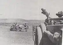 On 22 September an aerial reconnaissance reported that Haifa had been evacuated by the Ottoman army. This was found to be inaccurate when the Haifa Annexation Expedition was stopped by accurate Ottoman artillery and machine gun fire.[11] A reconnaissance by armoured cars of the Light Car Patrol encountered a redoubt 200 yards (180 m) from the road to Haifa. This strong rearguard with machine guns was supported by effectively positioned artillery deployed on the lower slopes of Mount Carmel. The redoubt was fired on by the cars' machine guns and quickly surrendered, while 2 miles (3.2 km) further on they encountered an Austrian battery of light field guns supported by German machine gunners which stopped the reconnaissance force.[12][13] They controlled the approach road from the east which ran between the mountain and the Nahr el Muqatta. This strong position could not be outflanked because the Nahr el Mugatta river was edged on both sides by marshes making it virtually impossible to cross.[13] The 5th Cavalry Division was ordered to capture Haifa and Acre 12 miles (19 km) north west the following day.[14]