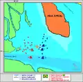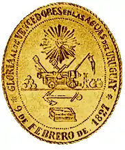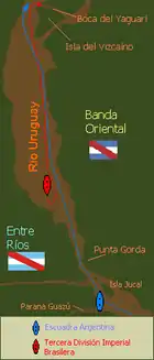Impeded from gaining access to the narrow channel, Brown withdrew to the south towards Punta Gorda to await the Brazilians. He landed a small force on Vizcaino Island to secure it and send instructions to the militia of Santo Domingo de Soriano to cut supplies to the Brazilian fleet.[2] In response, the Brazilians withdrew further north to Concepción del Uruguay (then still usually called "Arroyo de la China") where they could secure supplies.