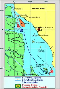 Mariath's orders were to use his ten vessels to overcome the fortifications at Martín García, attack the Argentine rear, and reinforce the Third Division.[11]