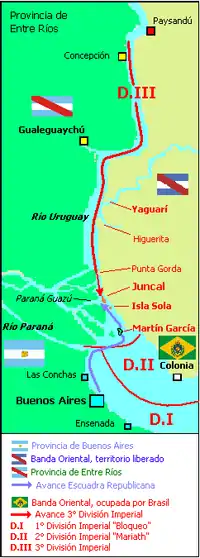 - The "Third Division", under the command of Jacinto Roque de Sena Pereira, was to remain in the Uruguay River in order to divide the Argentine front and exploit political fault lines between the province of Entre Ríos and Buenos Aires that had been exacerbated by the passing of the Unitary Constitution of 1826. By controlling the Uruguay River, the supply lines to an Argentine expeditionary force in the contested territory of Banda Oriental (modern Uruguay) would be cut, and the Brazilians would have freedom of maneuver for a later attack on the Argentine flank.