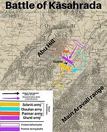 The Battle of Kasahrada, also known as Battle of Gadararaghatta was fought in 1178 CE at modern Kayandra in Sirohi district. It was fought between the Rajput Confederacy led by Chaulukya monarch Mularaja II and Naiki Devi Chandel against the Ghurid forces led by Shahbuddin Ghuri.[1] The Rajput forces defeated and routed the Ghurids, Shahbuddin Ghuri retired to Ghazni.