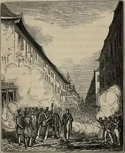 The Chinese attacked the southern and eastern city walls, overwhelming the British soldiers stationed at the southern city gate.[9] At the western city gate, a group of Chinese soldiers under the command of Tuan Yu-Fang approached the walls, and upon seeing that the gate was opened and seemingly undefended, were ordered to capture it by Yu-Fang. However, the British had mined the gate and deliberately left it open "in order to give the impression that they did not mean to defend it", and one hundred attacking Chinese soldiers were killed in the ensuing blast, forcing them to call off the attack.[15] Meanwhile, at the southern city gate, the attacking Chinese had pushed back the British soldiers stationed there into the city streets, but were eventually repelled by 150 British soldiers under the command of Sir Hugh Gough, with the British deploying a field artillery piece directly in a city street.[16] British and Chinese officials alike noted that many of the Chinese soldiers were under the influence of opium during the battle, which notably decreased their combat effectiveness. The Chinese retreated, having suffered between 500 and 600 casualties while the British suffered 5.[17] Historians have noted that heavy rains and mud had delayed the Chinese from swiftly bringing in reinforcements before and during the battle.[9]