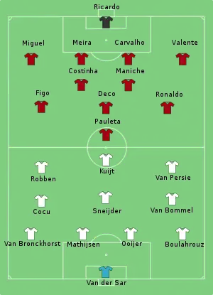 Portugal and the Netherlands had met at the semi-final stage of the previous major tournament, UEFA Euro 2004 held in Portugal, which had finished 2–1 to the host nation,[5] but had not featured the same level of animosity between the players. A total of five Dutch and eleven Portuguese players who took some part in that fixture were also on the field in Nuremberg.