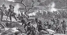 Wellington's first check came at the village of Pombal, which Ney initially yielded to the approaching Allied columns without a fight the morning of March 11.[8] As the British filed into the village, Ney ordered an abrupt about-face and counterattacked with three battalions, brusquely pushing the enemy from the town and throwing the British columns into disorder, with some troops being driven into the river and drowned. The French battalions then put Pombal to the torch, stalling the Allied pursuit and buying Masséna the crucial hours needed to occupy Coimbra—though, as it turned out, the opportunity was missed.[8]