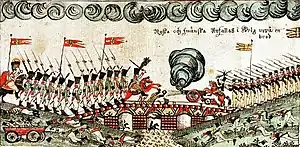 ![]() Ryska och Swänska Anfallas i Krig uppå en brod, by Lars Larsson (1784–1840); the painting [most likely] portrays the fighting at the Lejonström Bridge. | |||||||