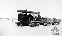As there was no water in the Ras en Naqb area, it was necessary to return to water at the Beersheba wells, which had been augmented by thunderstorms two or three days before the town was captured.[58][82] Although the wells in Beersheba had not been seriously damaged, the pumping engines could not be used and had to be replaced. New pumps were carried in by caterpillar tractors, while the pumping plant at Asluj was dismantled and brought in to Beersheba on 3 November. Several wells were found in gardens on 3 and 4 November, and although the water left after the thunderstorms and the wadies was soon exhausted, by 6 November 390,000 gallons a day were being produced, equaling demand.[88][89] This was supplemented by 100 motor lorries carrying full 1,800 litres (480 US gal) water tanks that shuttled between Beersheba and Karm 26 kilometres (16 mi) away.[90]