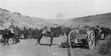 Four Ottoman divisions fought in the area: the 19th, 24th and 27th Divisions, and the 3rd Cavalry Division.[29][30] During the battle on 31 October, the Ottoman III Corps headquarters had retreated from Beersheba to Tel es Sheria but, the next day (1 November), moved to support the defence of the Jerusalem road from Edh Dhahriye. They were followed by the 143rd Regiment (24th Division) and 1,500 rifles of the Beersheba Group, which had been reorganised at Tel es Sheria. This latter group moved to defend Tel el Khuweilfe.[31] On 1 November, the 125th Regiment (16th Division) also moved west into the hills coming under the command of the 27th Division, while the 6th Cavalry Regiment covered the Ottoman left flank to Yutta.[32] Kress von Kressenstein also sent the 19th Division to reinforce the Seventh Army in the area.[29] This strong Ottoman presence defending the area was designed to encourage Allenby to commit more units to the attack, to take the pressure off the Ottoman forces defending Gaza and Sharia, and to lessen the possibility of an EEF breakthrough.[33][Note 3]