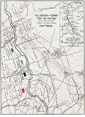 In January 1917, three Canadian Corps officers accompanied other British and Dominion officers attending a series of lectures hosted by the French Army regarding their experiences during the Battle of Verdun.[15] The French counter offensive devised by General Robert Nivelle had been one of a number of Allied successes of 1916. Following extensive rehearsal, eight French divisions had assaulted German positions in two waves along a 6 mi (9.7 km) front. Supported by extremely strong artillery, the French had recovered lost ground and inflicted heavy casualties on five German divisions.[16]