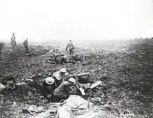 The only portion of the Canadian assault that did not go as planned was the advance of the 4th Canadian Division, collapsing almost immediately after exiting their trenches.[99] The commanding officer of one of the assaulting battalions requested that the artillery leave a portion of German trench undamaged.[100] Machine gun nests in the undamaged sections of the German line pinned down, wounded, or killed much of the 4th Canadian Division's right flank. The progress on the left flank was eventually impeded by harassing fire from the Pimple that was made worse when the creeping barrage got too far ahead of the advancing troops.[101][102] In view of the German defence, the 4th Canadian Division did not attempt a further frontal assault throughout the afternoon.[103]