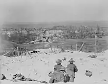 Three line divisions, comprising seven infantry regiments were responsible for the immediate defence of the ridge.[29] The paper strength of each division was approximately 15,000 men but their actual strength was significantly fewer. In 1917, a full-strength German rifle company consisted of 264 men; at Vimy Ridge, each rifle company contained approximately 150 men.[30] Each German regiment held a zone approximately 1,000 m (1,100 yd) wide as far back as the rear area. When the Canadian Corps attacked, each German company faced two or more battalions of approximately 1,000 men each.[31] Reserve divisions were kept about 24 km (15 mi) back instead of assembling close behind the second line according to the defence-in-depth theory.[32]