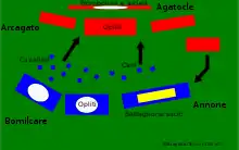 Panic ensued in Carthage when the inhabitants learned of the arrival of Agathocles in Libya. They thought that Agathocles would not have left Syracuse unless the Carthaginian army and navy there had been eliminated. Their panic subsided when Carthaginian messengers from Sicily reported that Agathocles had escaped the blockade and that Carthaginian forces in Sicily were still intact.[7] The council of elders appointed two Carthaginian rivals, Hanno and Bomilcar, as the generals of an army to defeat Agathocles. According to Diodorus Siculus, Bomilcar wanted to exploit this event to get rid of his rival and seize power in Carthage for himself.[8]