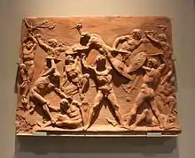The Battle of the Nudes or Battle of the Naked Men,[1] probably dating from 1465–1475, is an engraving by the Florentine goldsmith and sculptor Antonio del Pollaiuolo which is one of the most significant old master prints of the Italian Renaissance. The engraving is large at 42.4 x 60.9 cm, and depicts five men wearing headbands and five men without, fighting in pairs with weapons in front of a dense background of vegetation.