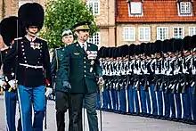 The full dress uniforms of the Royal Danish Army's Royal Life Guards includes the bearskin cap. The Royal Life Guards are foot guards whose duties includes providing the guard for the Danish monarchy. Bearskins were introduced to make guardsmen appear taller and more intimidating. The headgear was first adopted by the guard in 1805.[14]