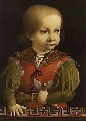 In recent months, however, relations between the two spouses had become very worn out due to the adulterous relationship that Ludovico had with Lucrezia Crivelli, his wife's lady-in-waiting.[53] Despite the bad moods, Beatrice found herself pregnant for the third time, but the pregnancy was complicated both by the sorrows caused by the discovery that Lucrezia was also expecting a child from Ludovico, something for which she felt deeply humiliated, and by the premature and tragic death of the beloved Bianca Giovanna,Ludovico's illegitimate daughter and her dear friend from the first day of arrival in Milan.[53] The birth finally took place on the night between 2 and 3 January 1497, but neither the mother nor the son survived.[54]