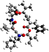 Beauvericin is a depsipeptide with antibiotic and insecticidal effects belonging to the enniatin family. It was isolated from the fungus Beauveria bassiana, but is also produced by several other fungi, including several Fusarium species;[1][2] it may therefore occur in grain (such as corn, wheat and barley) contaminated with these fungi.[2][3][4] Beauvericin is active against Gram-positive bacteria and mycobacteria, and is also capable of inducing programmed cell death in mammals.[2]