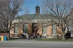 It is a buff-colored brick building with a copper-clad hipped roof.[2]