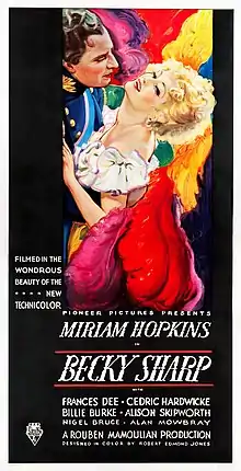 Becky Sharp is a 1935 American historical drama film directed by Rouben Mamoulian and starring Miriam Hopkins who was nominated for the Best Actress Oscar. Other supporting cast were William Faversham, Frances Dee, Cedric Hardwicke, Billie Burke, Alison Skipworth, Nigel Bruce, and Alan Mowbray.