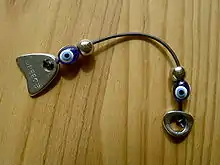Begleri (Greek: μπεγλέρι) is a small skill toy consisting of one or more beads at either end of a short string or chain. It can be flipped and twirled around the fingers to perform tricks. The begleri originated in Greece, and was originally derived from the komboloi, which serves the function of worry beads, and are often flipped around to pass the time or keep the hands busy. While komboloia have beads forming a closed circle, begleri beads are threaded on an open strand, usually in a symmetrical formation, with equal weighting at either end;[1] this is sometimes referred to as "open-string begleri". Begleria come in many forms, consisting of semi-precious stone or metal beads. They can be similar in form to the percussion instrument kashaka, but are much smaller in size.