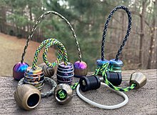 Due to the nature of play, begleri have shifted from traditional ornate beads to simpler performance-oriented beads. Two common begleri types are monkey-fist "beads", made from paracord, and solid beads, which can be made of metal (aluminum, steel, titanium), acrylic resin, Delrin, or wood.[3] Monkey-fist begleri are commonly made by people beginning to practice "slinging", the common term for begleri manipulation; solid type beads are becoming more and more common, and there a few companies that are developing new geometries of beads based on feedback from consumers.