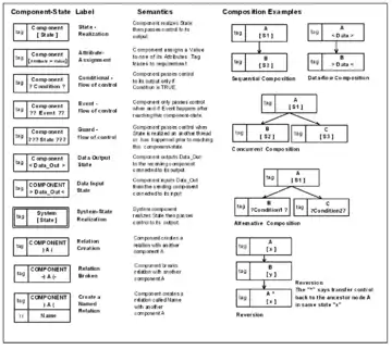 Behavior is expressed in terms of components realizing states and components creating and breaking relations. Using the logic and graphic forms of conventions found in programming languages, components can support actions, composition, events, control-flow, data-flow, and threads.[3]