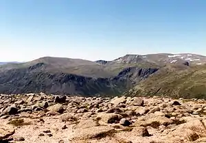 Beinn a' Chaorainn is a Scottish mountain in the heart of the Cairngorms range. It is quite a remote hill, being located roughly 19 kilometres south east of Aviemore and 14 kilometres north west of Braemar. The mountain stands on the border of the Moray and Aberdeenshire council areas. The hill's name used to be spelt as Beinn a' Chaoruinn,[2] but the spelling of the word caorunn (in genitive case here) was altered to caorann by the Gaelic Orthographic Convention's attempts to standardise spelling.