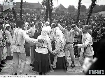 Belarusian traditional dance is a form of stage dance known for its originality.[1][2] The history of Belarus and efforts to preserve Belarusian traditions have shaped the dances in use today, which have many ancient and archaic elements.[3] These dances started to form in the 14th century, and originated in East Slavic rites. In the middle of the 19th century, traditional folk dancing began to merge with quadrilles and polkas from Western Europe.