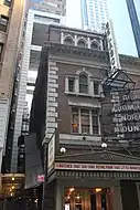The Belasco Theatre was designed by George Keister, the architect of the neighboring Hotel Gerard, in the neo-Georgian style. It was constructed from 1906 to 1907 as the Stuyvesant Theatre and was originally operated by David Belasco.[3][6] The neo-Georgian style was selected because a similar style was used on many early government buildings of New York City.[6] The original name was a homage to Peter Stuyvesant, a director-general of New Amsterdam, the 17th-century Dutch colony that later became New York City.[6][7][8] Compared to its contemporaries, the Belasco is relatively small.[6] A wing for offices and dressing rooms, separated from the rest of the theater by a thick wall, was constructed on the west side of the theater.[9][10] The eastern part of the theater is topped by a private duplex apartment built in 1909.[11]