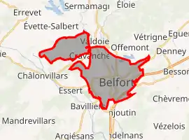 Belfort is 400 km (250 mi) from Paris, 141 km (88 mi) from Strasbourg, 290 km (180 mi) from Lyon and 150 km (93 mi) from Zürich. The residents of the city are called "Belfortains". The city is located on the river Savoureuse, on a strategically important natural route between the Rhine and the Rhône – the Belfort Gap (Trouée de Belfort) or Burgundian Gate (Porte de Bourgogne). It is located approximately 16 km (10 mi) south from the base of the Ballon d'Alsace mountain range, source of the Savoureuse. The city of Belfort has 46,443 inhabitants (2019).[2] Together with Montbéliard, Héricourt, Delle and their suburbs and satellite towns, Belfort forms the largest agglomeration (metropolitan area) in the Bourgogne-Franche-Comté region with an urban population of 308,601 inhabitants.[3]