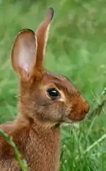 The Belgian Hare is a "fancy" (i.e., non-utilitarian) breed of domestic rabbit that has been selectively bred to resemble the wild European hare.[1] It is a rabbit rather than a true hare. Averaging 6–9 pounds (2.7–4.1 kg), the Belgian Hare is known for its slender and wiry frame and its long and powerful legs.
